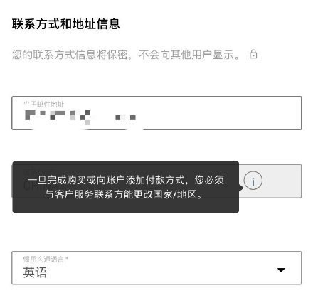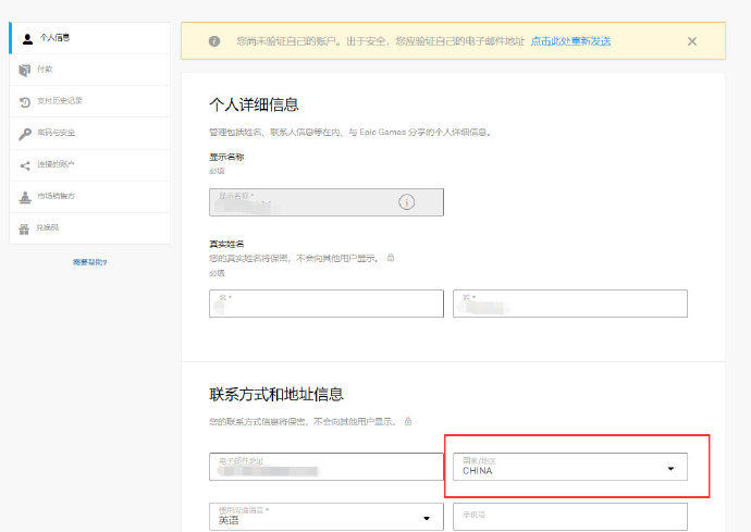 “国家/地区”在账户里设置,需要说明的是,只要购买过一次游戏,国区的“国家/地区”将无法更改,必须联系客服,这应该是Epic为了避免有人钻篓子设的限制。其他地区不知道是不是这样,如果是的话,之前在外服买过游戏的玩家这次想回归国区,可能要联系客服,或者重新注册个账号。