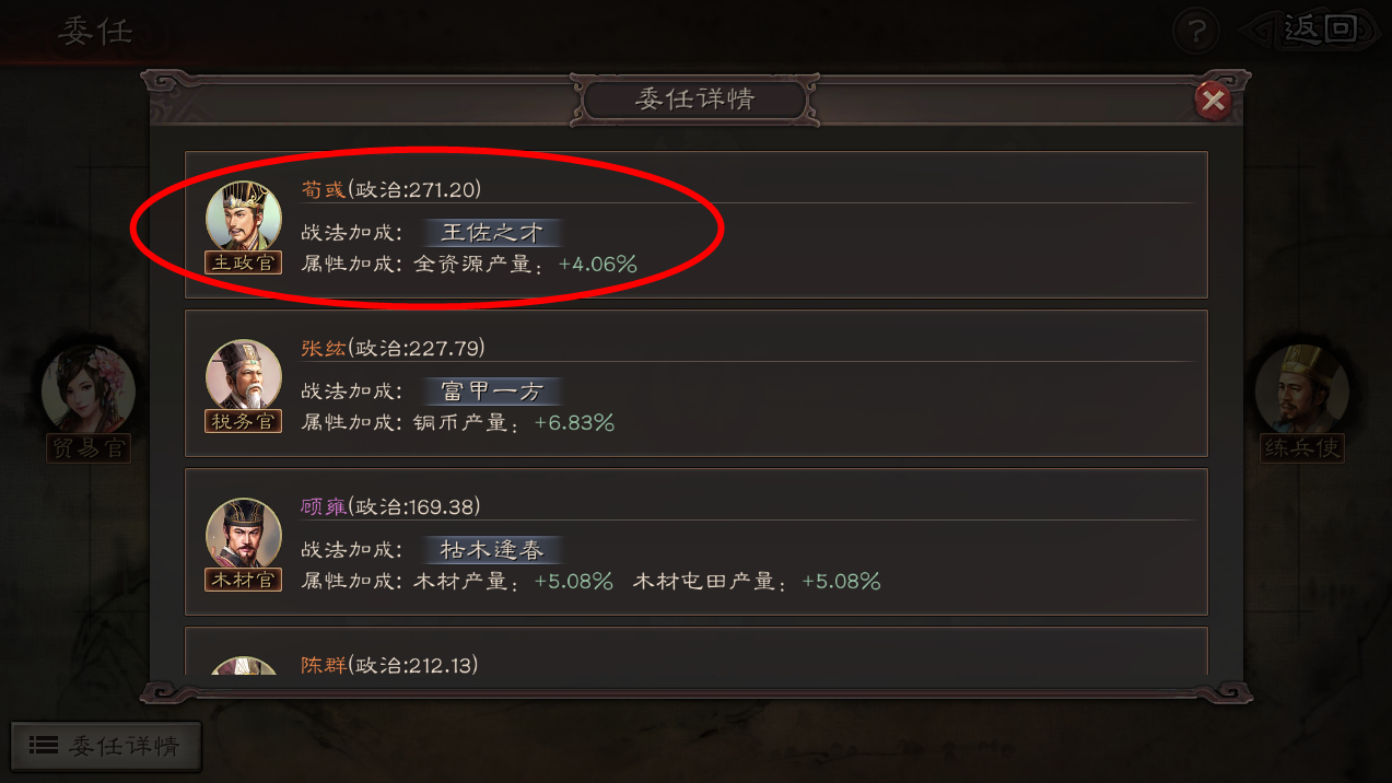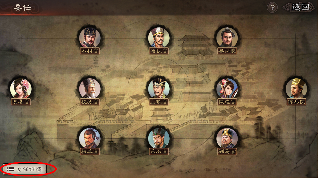 在委任详情中可以查看每个委任的武将带来的城池收益: