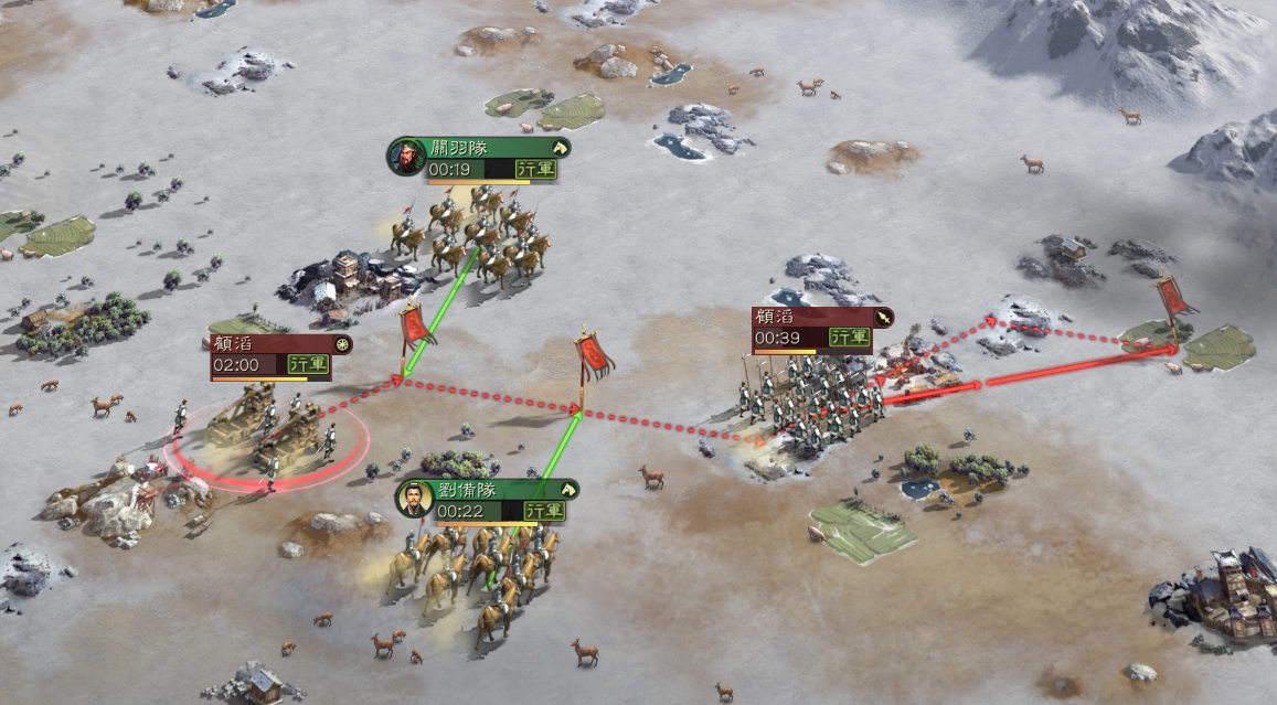 不论是在外停留或是在行军途中,当部队与非友好同盟的部队到达同一地块时便会发生战斗,只有胜利的一方能够继续行军,战败的一方将会自动撤退回城。在实际战斗中,可以通过行军来截击敌军,在掌握敌军路线后,可以将部队行军至敌方部队的行军路径上,待敌军部队与我方部队相遇时,便会发生战斗,若能成功战胜敌军,便能成功击退敌军,打破敌方的行动策略。