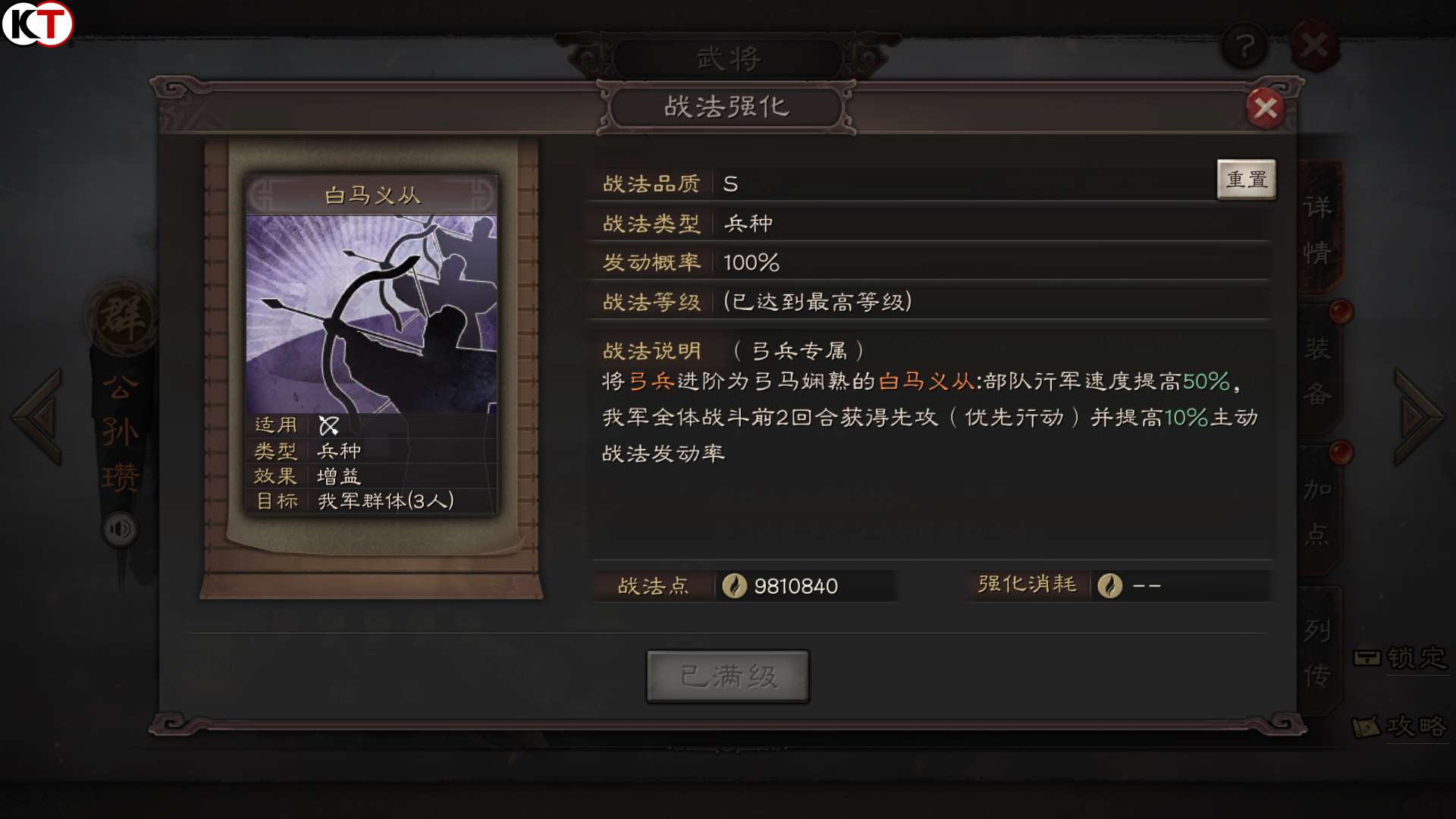 满级效果:将弓兵进阶为弓马娴熟的白马义从;部队行军速度提高50%,我军全体战斗前2回合获得先攻(优先行动)并提高10%主动战法发动率。